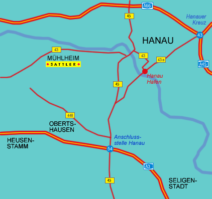 Der A45 Richtung Hanau / Würzburg bis zum Hanauer Kreuz folgen und dort auf die B43A Richtung Dieburg, das ist die mittlere von fünf parallelen Fahrspuren, wechseln. An der Ausfahrt Hanau Hafen abfahren und rechts in die Rodgaustraße einbiegen Richtung HU-Stadtmitte / HU-Hafen.